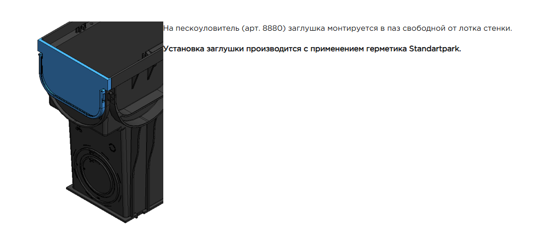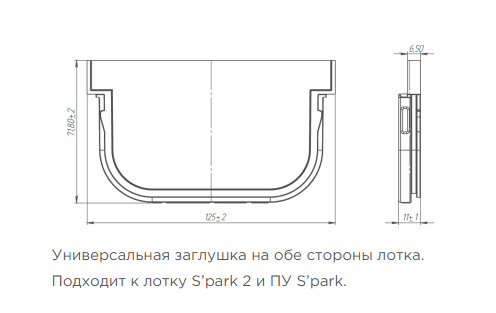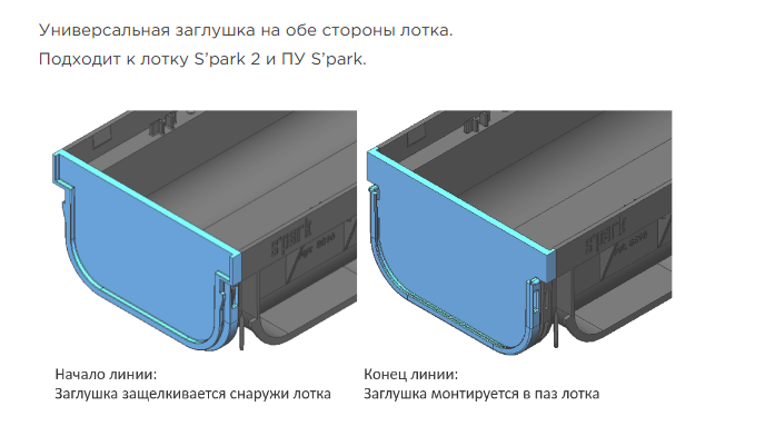 Универсальная заглушка Spark-2 устанавливается на обе стороны лотка. Подходит к лотку Spark-2 и Пескоуловителю Spark-2. В начале линии заглушка защелкивается снаружи лотка. В конце линии монтируется в паз лотка.