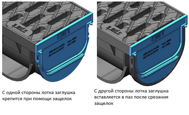 Универсальная заглушка Spark-3 монтируется как в начале, так и в конце водоотводной линии. А также может использоваться как переходник между водоотводными лотками с артикулами 8810 и 8820. С одной стороны лотка заглушка крепится с помощью защелок. С другой стороны заглушка вставляется в паз после срезания защелок.