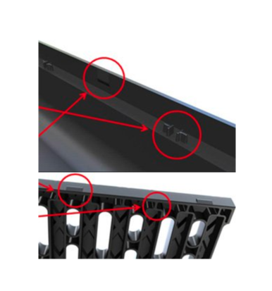 Крепление решетки к лотку осуществляется благодаря наличию на поверхности лотка 20-ти Т-образных сдвоенных креплений (по 10 на каждой стороне изделия). Решетка защищена от вертикального смещения относительно лотка благодаря выступам на боковых планках лотка и боковых поверхностях решетки (по 10 на каждой стороне) и поперечным ребрам жесткости на решетке, которые служат также замками для надежного крепления и защищают от горизонтального смещения решетки.