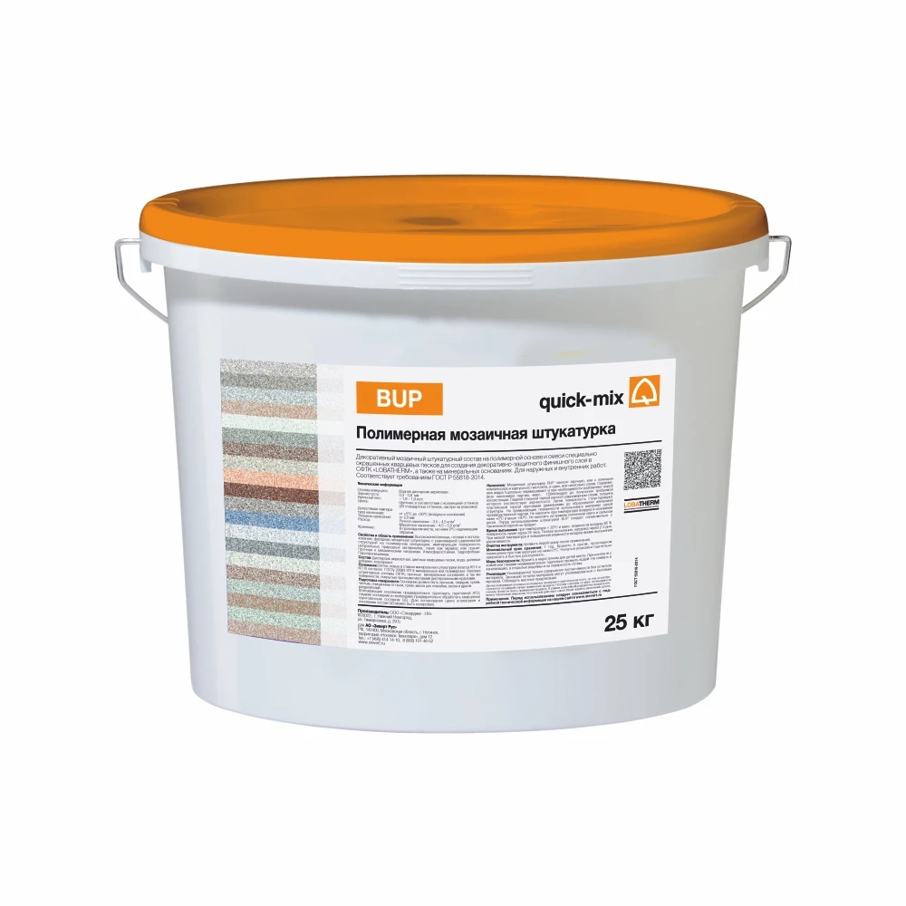Мозаичная штукатурка quick-mix BUP — готовая к применению декоративная штукатурка на полимерной основе с добавлением специально окрашенных кварцевых песков. Кварцевая декоративная штукатурка BUP позволяет создать фактурный финишный слой с равномерно-шероховатой поверхностью, имитирующей натуральный камень (мрамор, гранит). Декоративная мозаичная штукатурка quick-mix BUP предназначена для нанесения на минеральные основания снаружи, в т.ч. в составе систем фасадной теплоизоляции LOBATHERM, и внутри помещений.